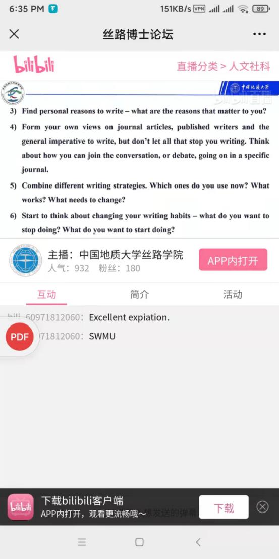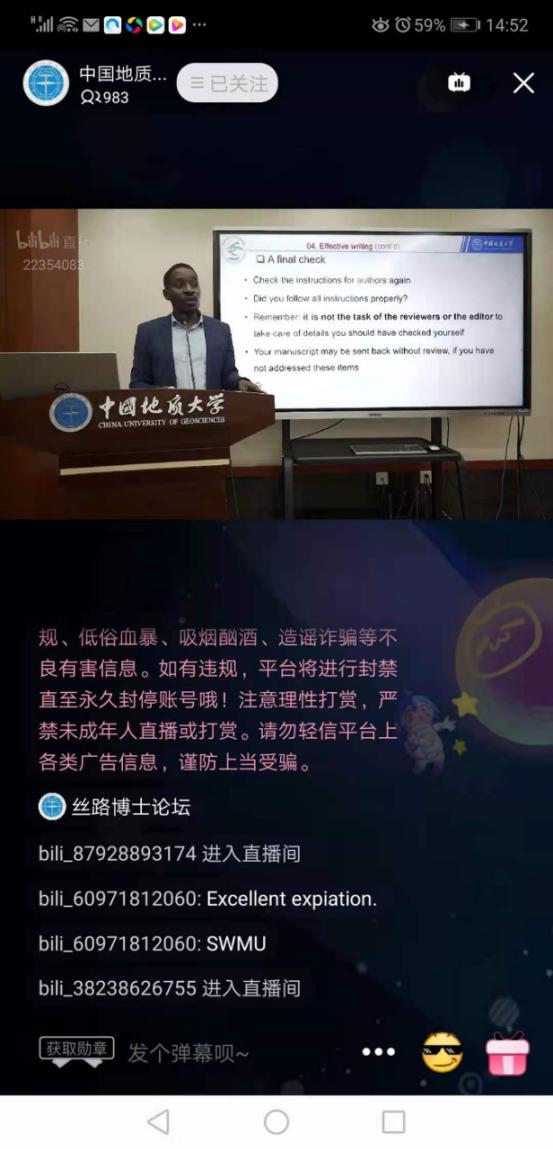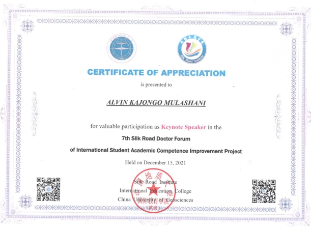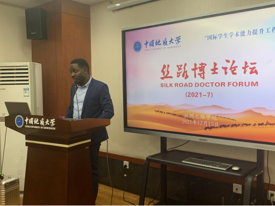 (通讯员 赵阳平 摄影 贾力)12月15日,2021年第七期丝路博士论坛由坦桑尼亚籍资源公司博士研究生ALVIN KAJONGO MULASHANI (中文名:穆拉沙),喀麦隆籍康亦灵主持,穆拉沙以《 Easing Academic Paper Writing and Publication Process (My experience)》为主题做论坛,线下20余名硕博研究生在丝绸之路公司会议室参加讲座,近千人在境内外参加线上讲座。