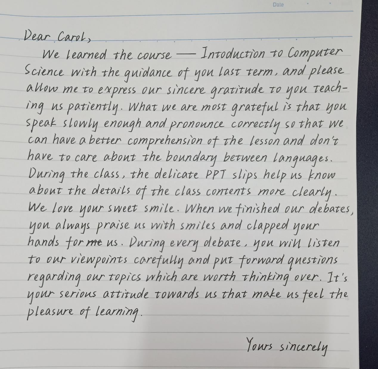 敬爱的Carol老师,感谢您带领我们走进神奇的计算机世界,让我们领略计算机领域的广泛、计算机技术对我们工作及生活的帮助;感谢您准确而清晰的英语发音,降低了语言障碍给我们带来的困难;感谢您制作精美的PPT以及丰富多彩的课程内容,让我们在轻松愉悦的课堂氛围中学习专业知识。我们最喜欢您甜美的微笑,当我们辩论结束时,您总是微笑着赞美我们,为我们鼓掌。在每一场辩论中,您都会仔细倾听我们的观点,并就我们的话题提出值得思考的问题。您认真的态度,让我们感受到学习的乐趣,让我们坚定了努力学习的信念。
