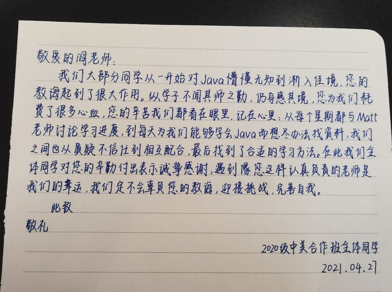 尊敬的Matt老师,还记得我们最开始学习Java的时候,计算机知识的匮乏以及语言不通导致上课效率较低,给我们和您带来了很大的困扰,您想尽一切办法帮助我们掌握课堂知识。您提供的课程视频字幕,极大地提高了我们的听课效率;您克服时差困难与助教老师进行交流,了解我们的学习情况。言语已经无法表达我们对您的感激之情,您的教诲让我们知道了编程的严谨和乐趣,让我们爱上这门学科,并不断为之付出努力。