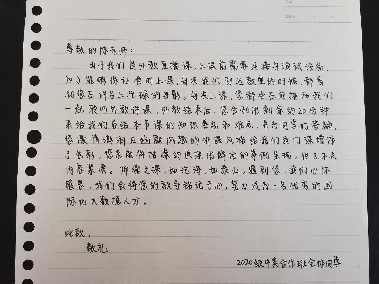 尊敬的陈老师,由于我们是外教直播课,上课前需要连接并调试设备,为了能够保证准时上课,每次我们到达教室的时候,都看到您在讲台上忙碌的身影。每次上课,您都坐在前排和我们一起聆听外教讲课,外教结束后,您会利用剩余的20分钟来给我们总结本节课的知识要点和难点,并为同学们答疑。您激情澎湃且幽默风趣的讲课风格给我们这门课增添了色彩,您总能将枯燥的原理用鲜活的事例呈现,但又不失内容紧凑。师德之深,如沧海,如泰山,遇到您,我们心怀感恩,我们会将您的教导铭记于心,努力成为一名优秀的国际化大数据人才。