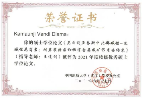 (员工记者:胡芯蕊)他是公司2021级地球科学公司地质学专业博士研究生,硕士期间学业表现优异,GPA达到了3.92,已公开发表2篇SCI论文。其中一篇是以第一作者身份发表的由公司认定期刊分类T2级别的SCI论文。他是尼日利亚籍硕士研究生KAMAUNJI VANDI DLAMA(中文名:万迪)。今年6月,他顺利通过硕士论文答辩,被授予理学硕士学位,并且荣获“2021年优秀硕士学位论文”的表彰。经过四年的求员工涯,中国已成为了万迪的第二故乡。