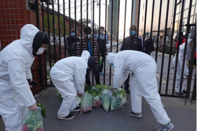 图五:2月20日,罗文旭(左一)前往九峰社区为校外住宿的地大职工送去蔬菜和面粉等生活物资